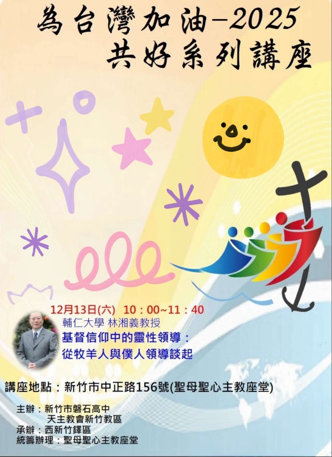 | (一) | 12/13(星期六) 上午10時~11時40分,由輔仁大學 林湘義教授主講「基督信仰中的靈性領導:從牧羊人與僕人領導談起」。 |