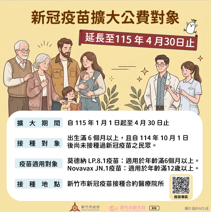 守護最愛的人,全家一起來!新冠疫苗公費接種措施延長至115年4月30日止。請尚未接種本季新冠疫苗之師生及家長,把握時間儘早完成接種,提升保護力,降低感染及重症風險,共同守護自己與家人的健康。