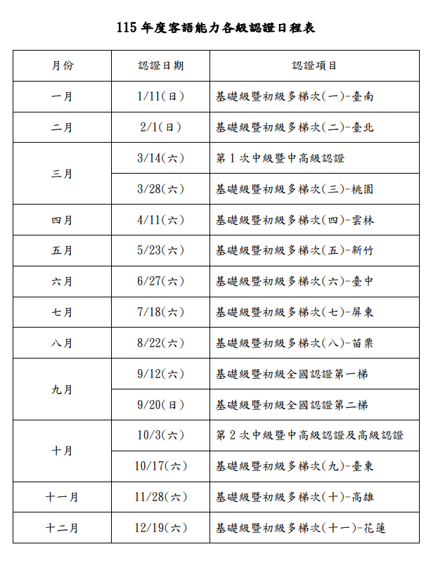 因應客語師資需求,客委會將於115年3月14日(星期六)及10月3日(星期六)各辦理1梯次「客語能力中級暨中高級認證」,請鼓勵所屬學校教師踴躍參加。