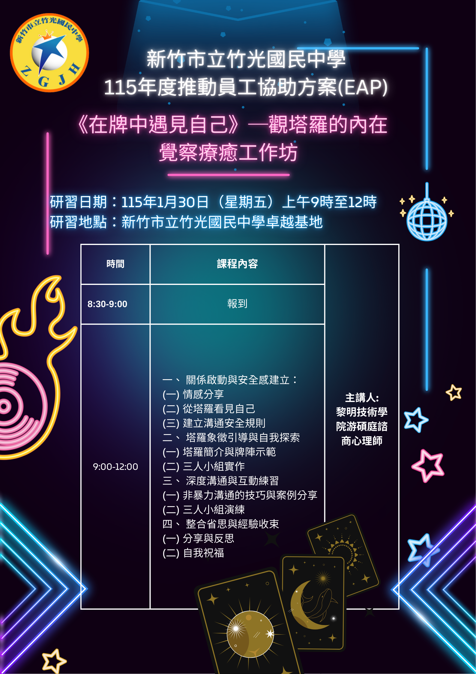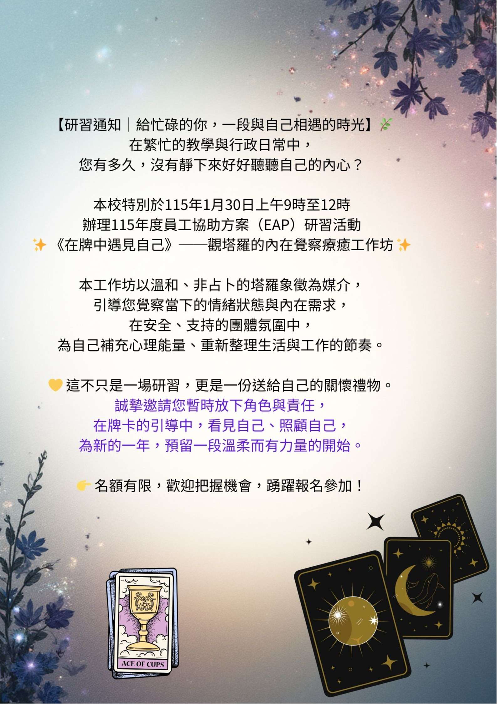 | 主旨: | 竹光國中謹訂115(本)年1月30日(星期五)上午辦理「115年度推動員工協助方案(EAP)《在牌中遇見自己》──觀塔羅的內在覺察療癒工作坊」,請轉知所屬踴躍報名參加。 |